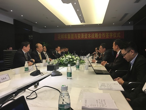 2016年12月2日,花樣年集團與安澤資本在深圳簽訂戰(zhàn)略合作協(xié)議,花樣年控股董事局主席潘軍先生及安澤資本創(chuàng)始合伙人顏光茂先生共同出席并在簽字協(xié)議上簽字?;幽昙瘓F副總裁林錦堂、助理總裁簡堅訓(xùn)、助理總裁鄧波、地產(chǎn)集團總裁劉宗保、安澤資本總經(jīng)理吳亮共同出席了本次簽字儀式。